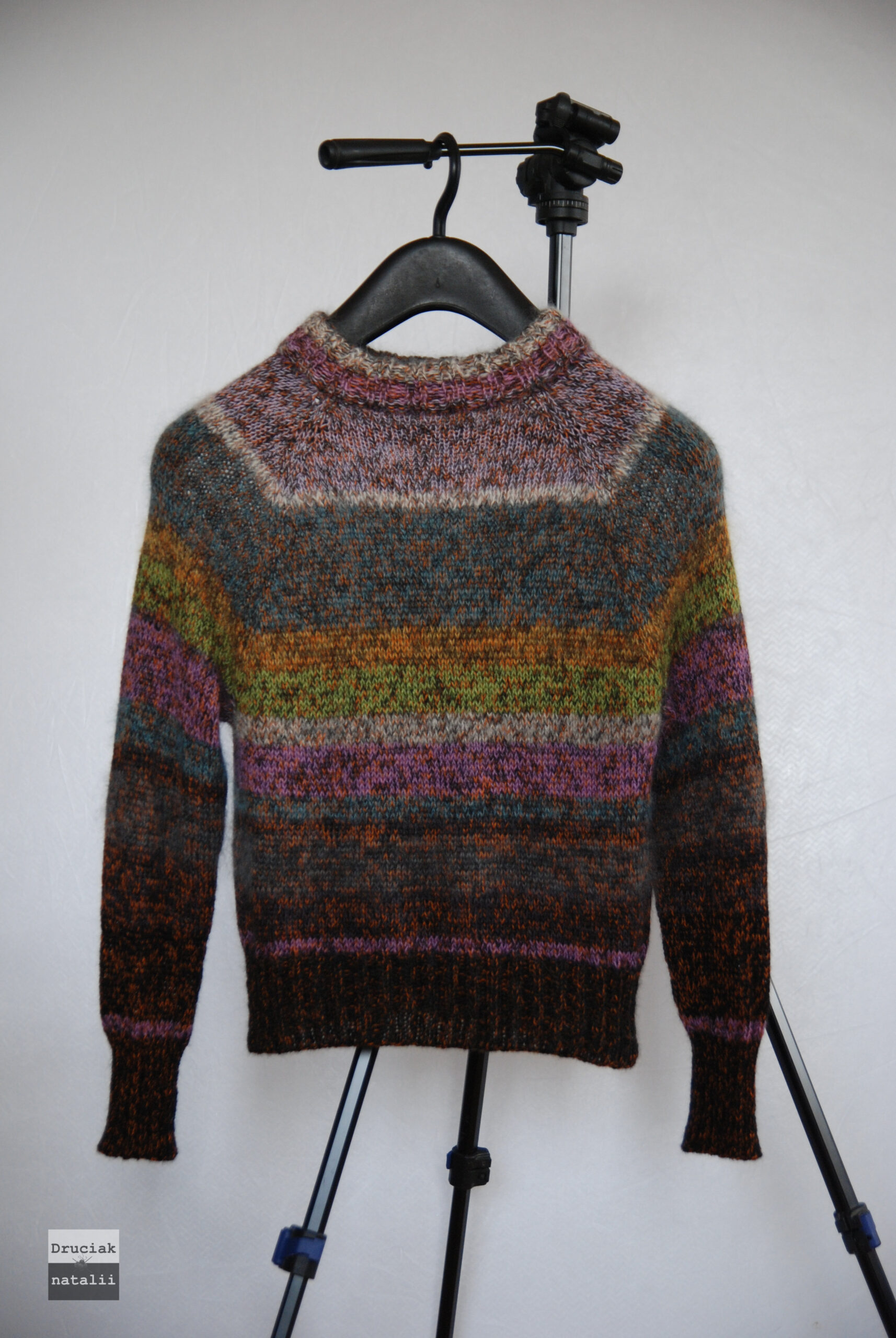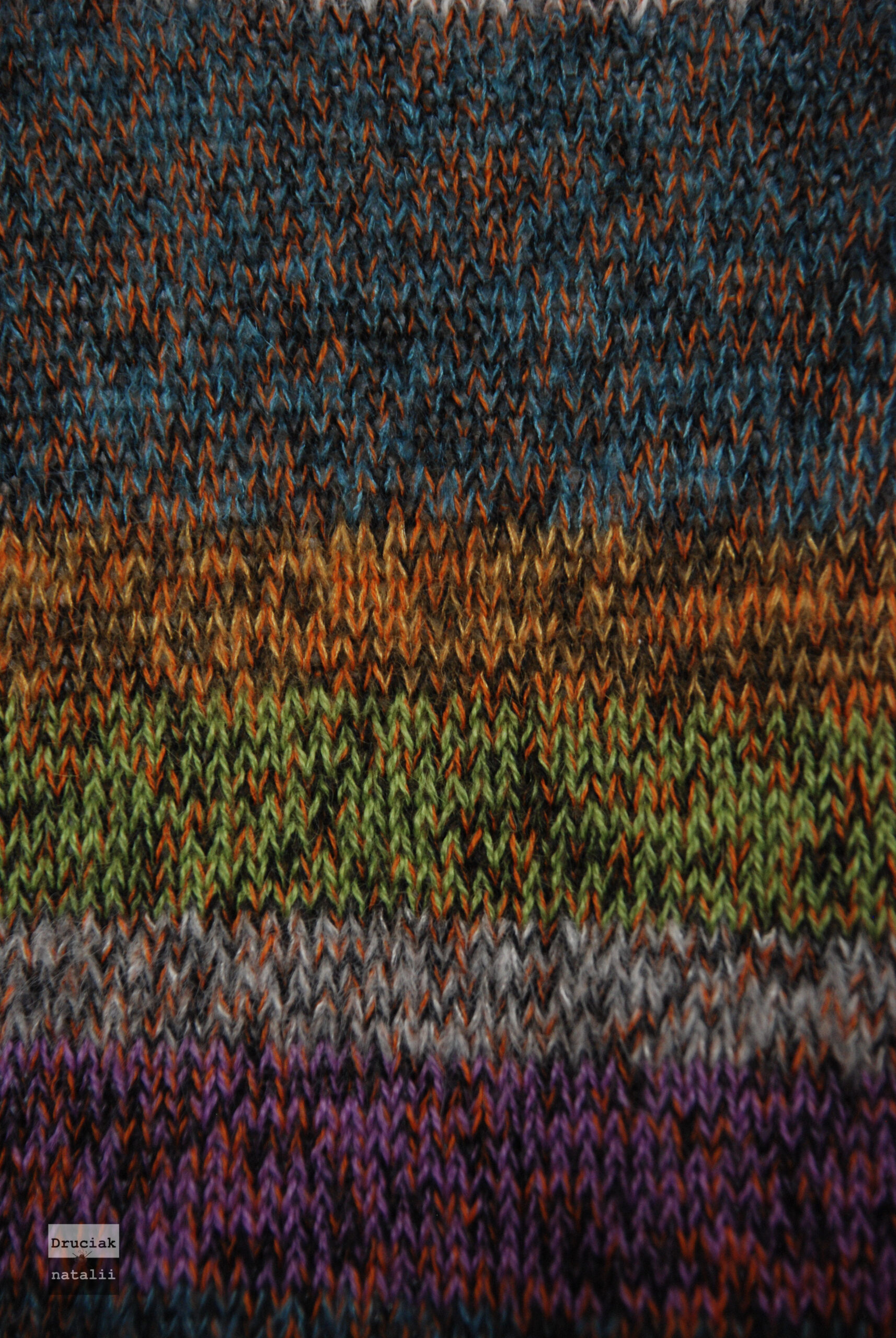 Mam pełne pudło różnych końcówek, co jakiś czas zaglądam tam i bywa, że rodzi się jakiś pomysł. Czapka, opaska, szal, pasek, ale tym razem sweter. Reglan z podwójnym wykończeniem dekoltu. Zebrałam całą włóczkę z alpaki ( ggh i Rovan), jeden spory motek merino ( Lana Gatto i Malabrigo) , wszystkiego około 250-300 g. Istotne by każda z wybranych włóczek miała podobną grubość, dzianina jaka powstaje jest jednorodna, zmienia się jej kolor, ale nie grubość.