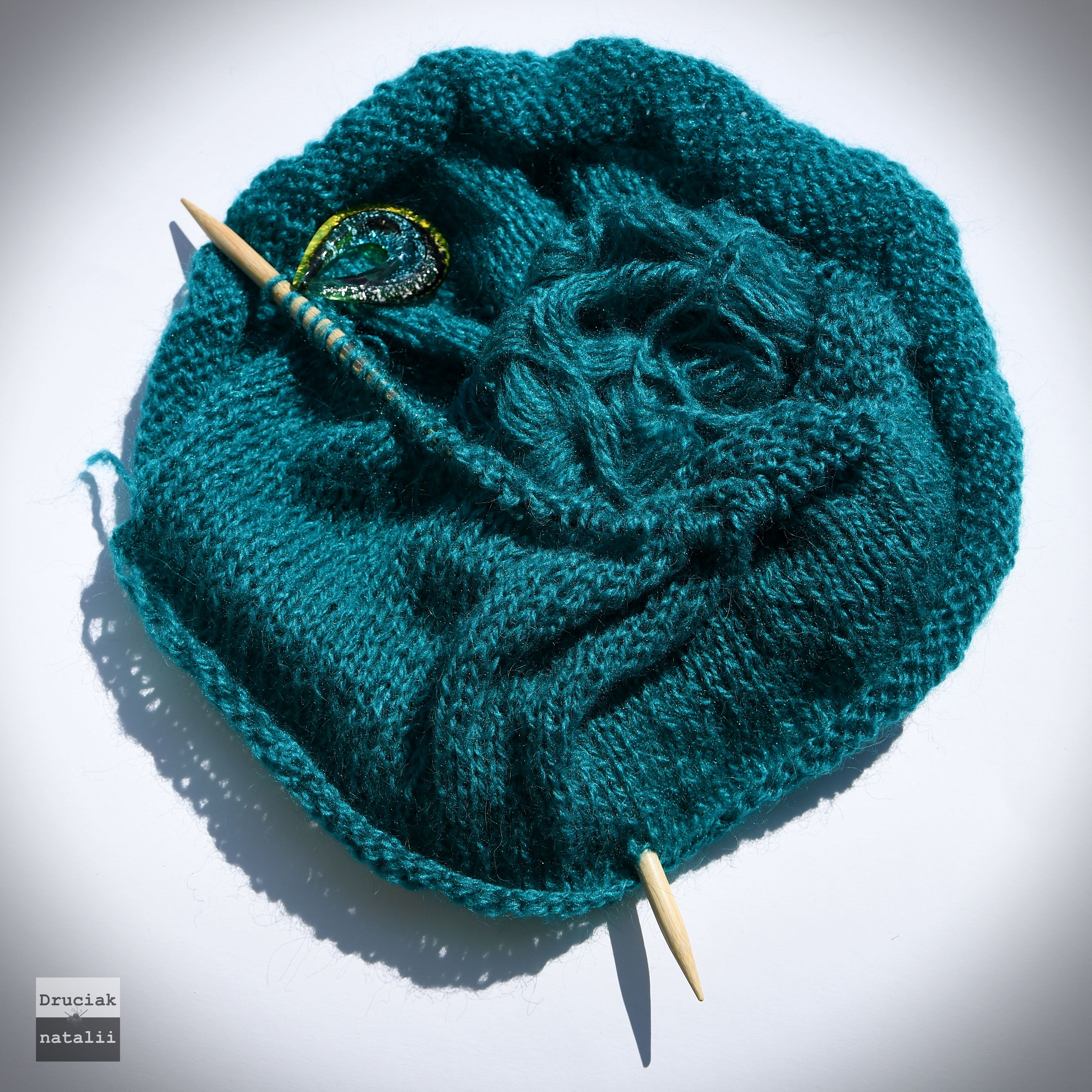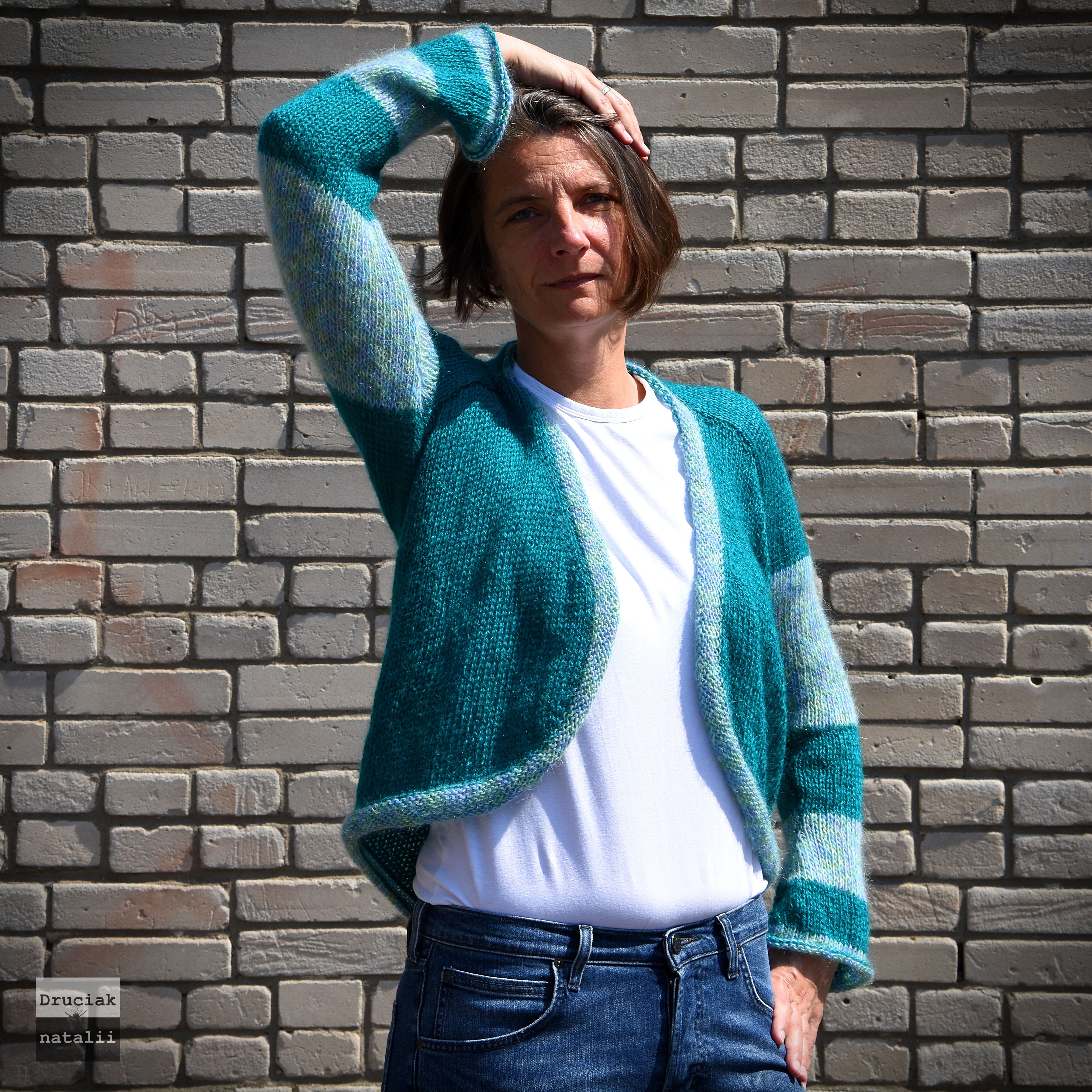 W moje ręce trafiła włóczka- mieszanka moheru i akrylu- w soczyście zielonym kolorze. W przepastnych szafach z zapasami znalazłam moherowy melanż błękitu i zieleni, który idealnie do niej pasował . I tak zrodził się pomysł na letni, miękki sweter.