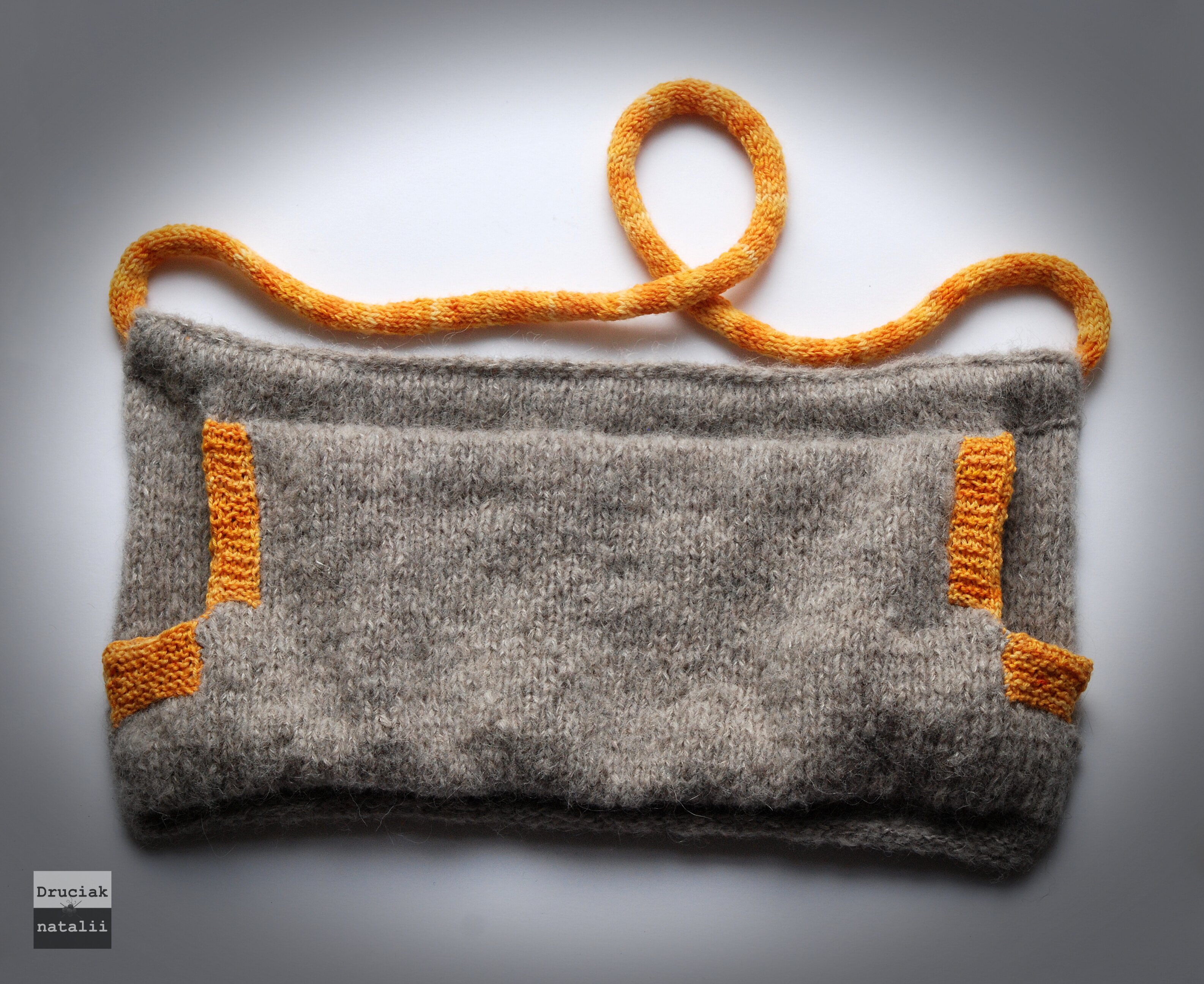 Pomysł na mufkę przyszedł nieoczekiwanie. Pomimo masy wątpliwości zdecydowałam dać jej szansę. Został mi motek alpaki i pół motka merino, obie włóczki lekkie , miękkie i bardzo ciepłe- doskonałe do tego projektu. Kolory też ładnie się uzupełniają. Najpierw pojawiła się szara część – prostokąt z odpowiednimi wycięciami, tak by po złożeniu powstała kieszeń na ręce. Druty 5 mm , jersey. Kolejnym etapem było wrobienie we wnętrze kieszeni drugiej warstwy i tu przydało się wściekle żółte merino druty 3.5 mm jersey, tylko końcówki francuski ( te wywinięte na zewnątrz). Żółta tasiemka I-cord druty 3.5mm. Wymiary mufki: 42 cm szerokość, 22 cm długość, długość paska to 78 cm.
