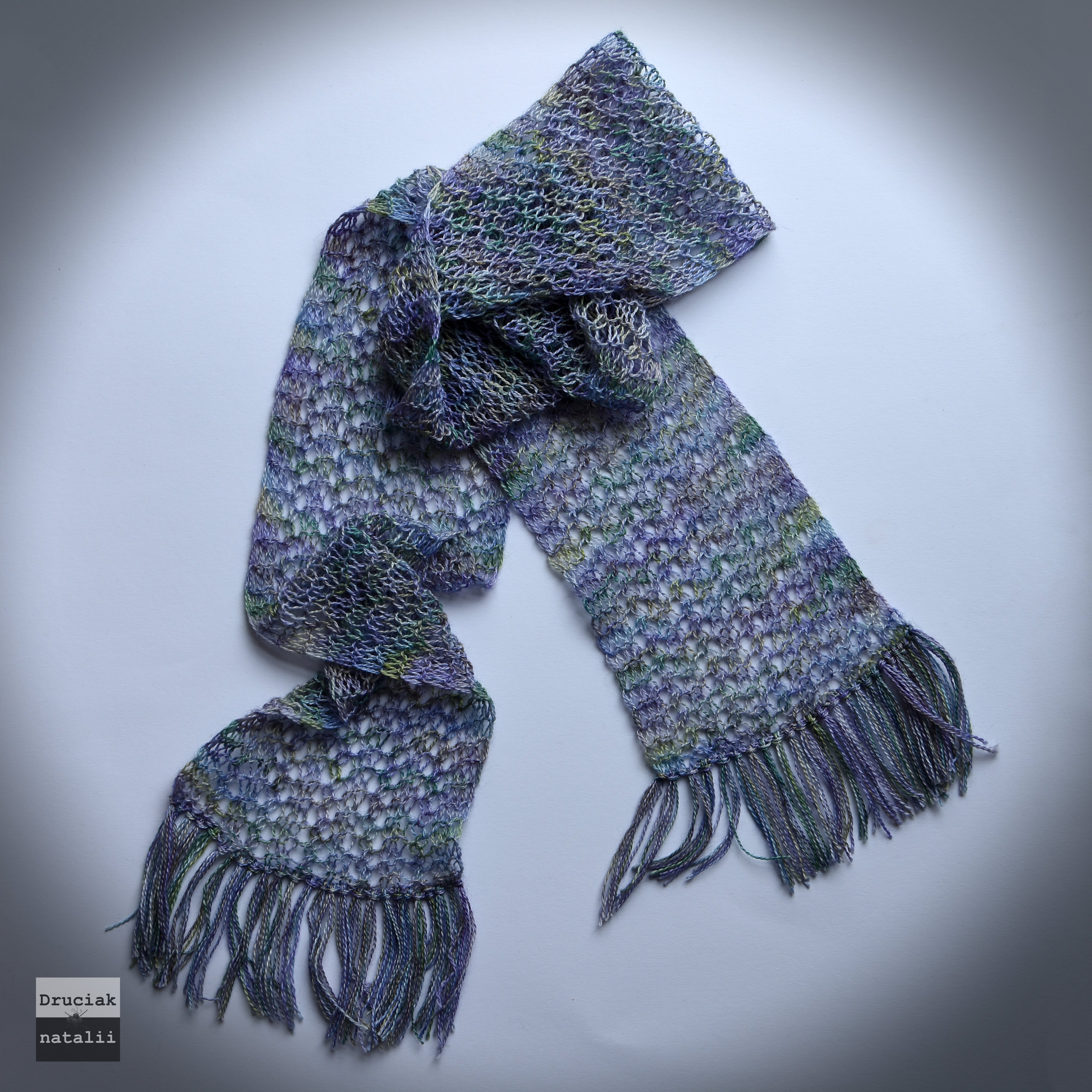 Następnie na warsztat trafiła szarfa. Przeglądałam brytyjskie strony z rękodziełem i wzorami ażurowymi i wpadł mi w oko niezwykle prosty, ale moim zdaniem piękny motyw . Nie ma on jakiejś konkretnej nazwy, ale jeśli chcecie spróbować to tu link: https://intheloopknitting.com/lacy-scarf-knitting-patterns/ Oczywiście trochę po swojemu pozmieniałam , a efekt sami oceńcie. Na całość zużyłam około 30g włóczki Malabrigo mieszanki jedwabiu i alpaki. Pracowałam na mniejszych drutach niż podano przy wzorze i dodałam frędzle. Teraz mam i taki szal w swoim dorobku.