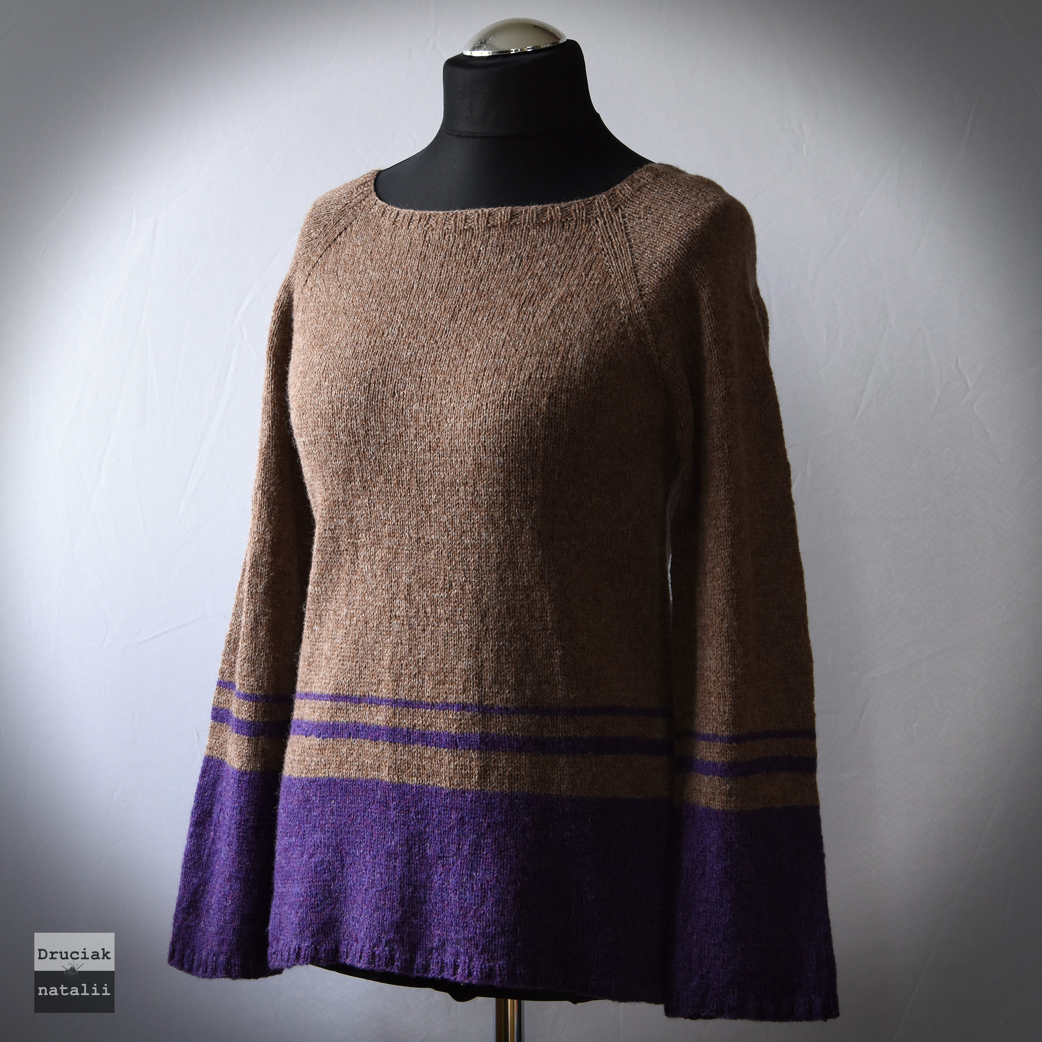 We wrześniu jesień zaczęła zaglądać powoli w okna , tym samym pojawił się pomysł na sweter z wełny szetlandzkiej w nietypowych barwach: brązie i fiolecie. Sweter reglan z długimi rękawami w rozmiarze L. Góra brązowa z okrągłym dekoltem, na wysokości talii pomiędzy brązem pojawiają się coraz szersze fioletowe paski. Fioletowy dół swetra lekko się rozszerza i tym samym bardziej podkreśla talię. Projekt wykonany pojedynczą nitką na drutach 4mm. Na całość użyłam 250g włóczki w obu kolorach.