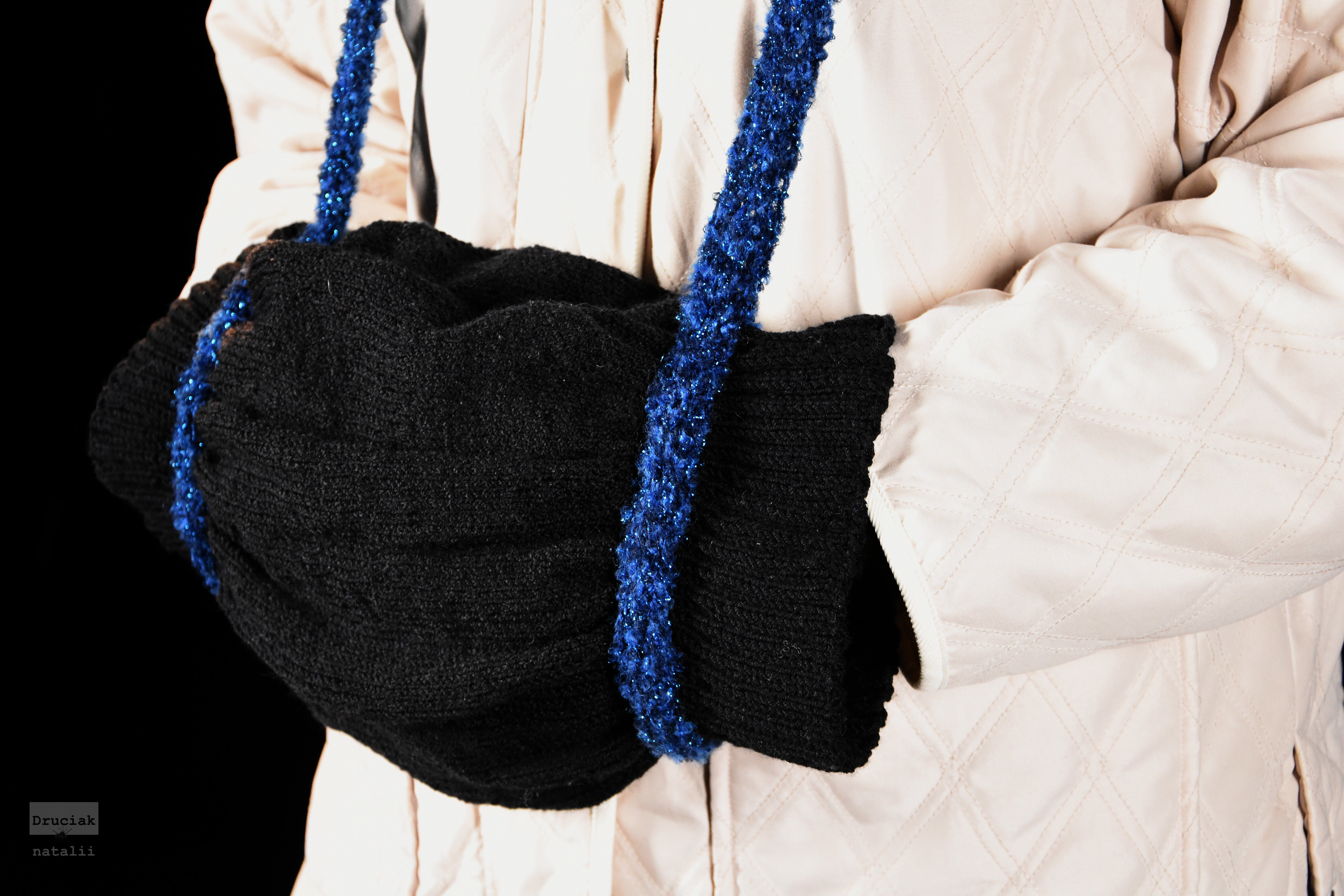 Po skończeniu swetra na warsztat weszły tuby. Najpierw czarno-niebieska i błyszcząca. Wzór warkocza w czarnym kolorze i pomiędzy warkocze wpleciony błyszczący niebieski motyw. Wymiary komina to 35/88 cm. Włóczka merino i akryl, druty 4,5mm.